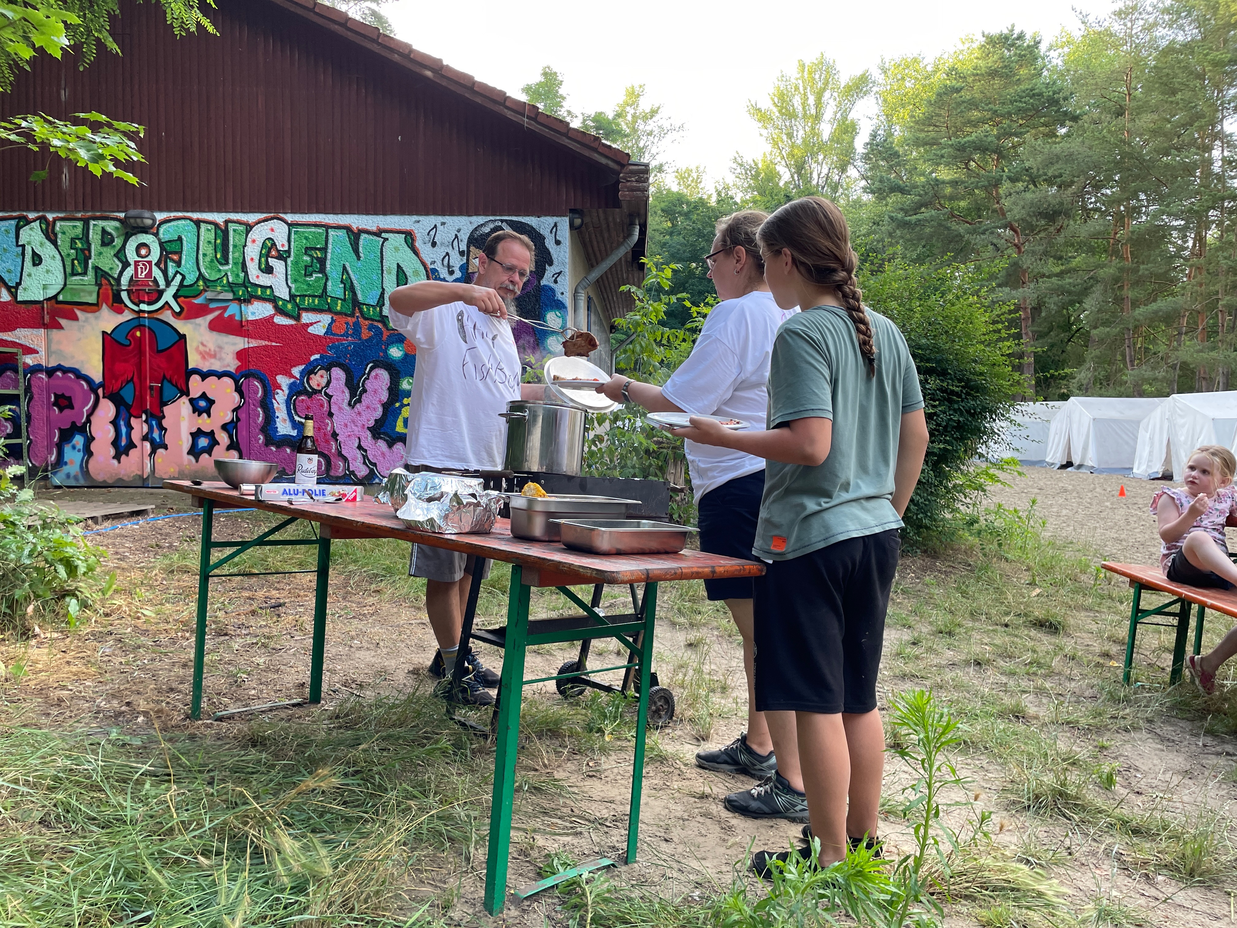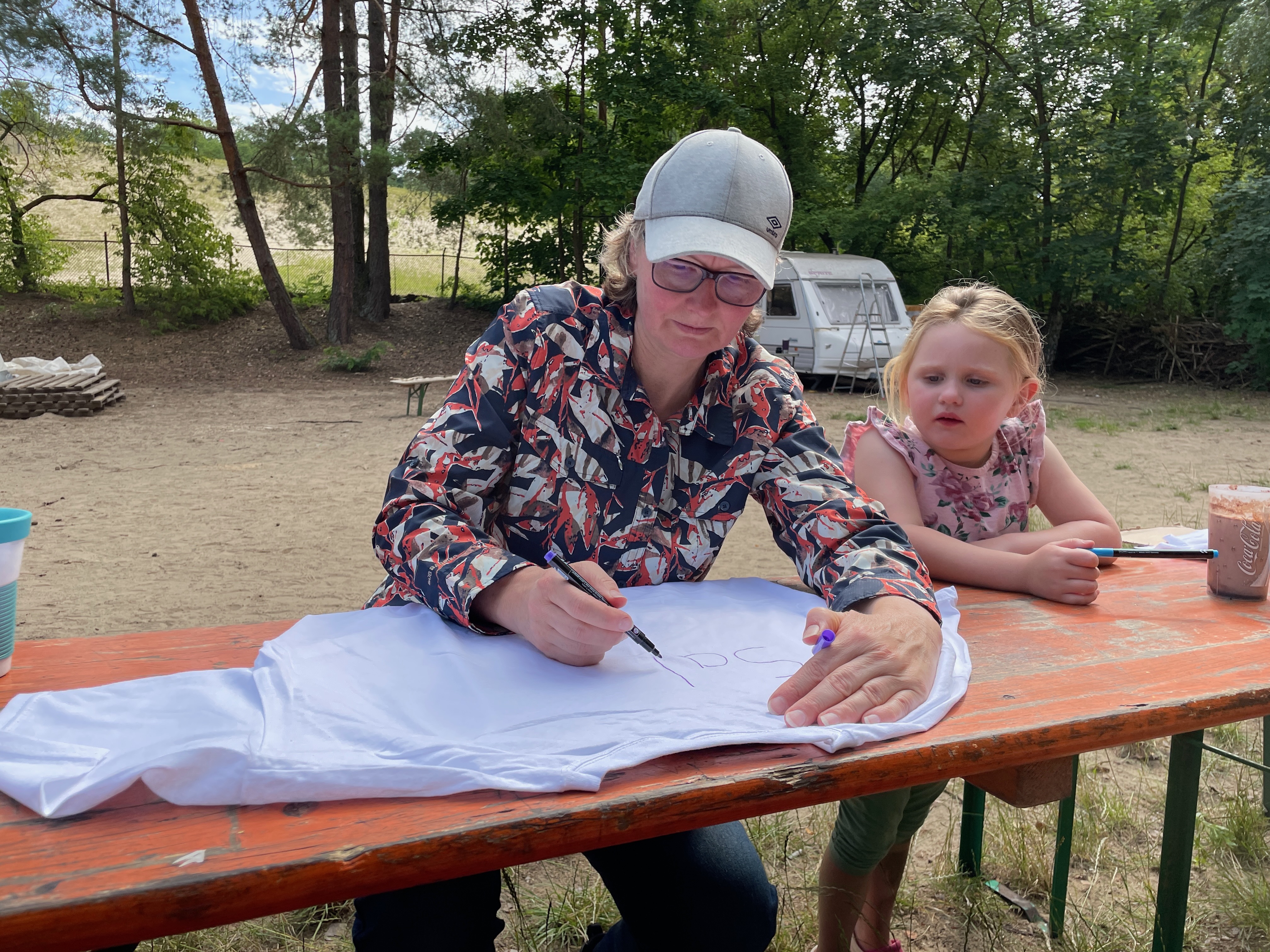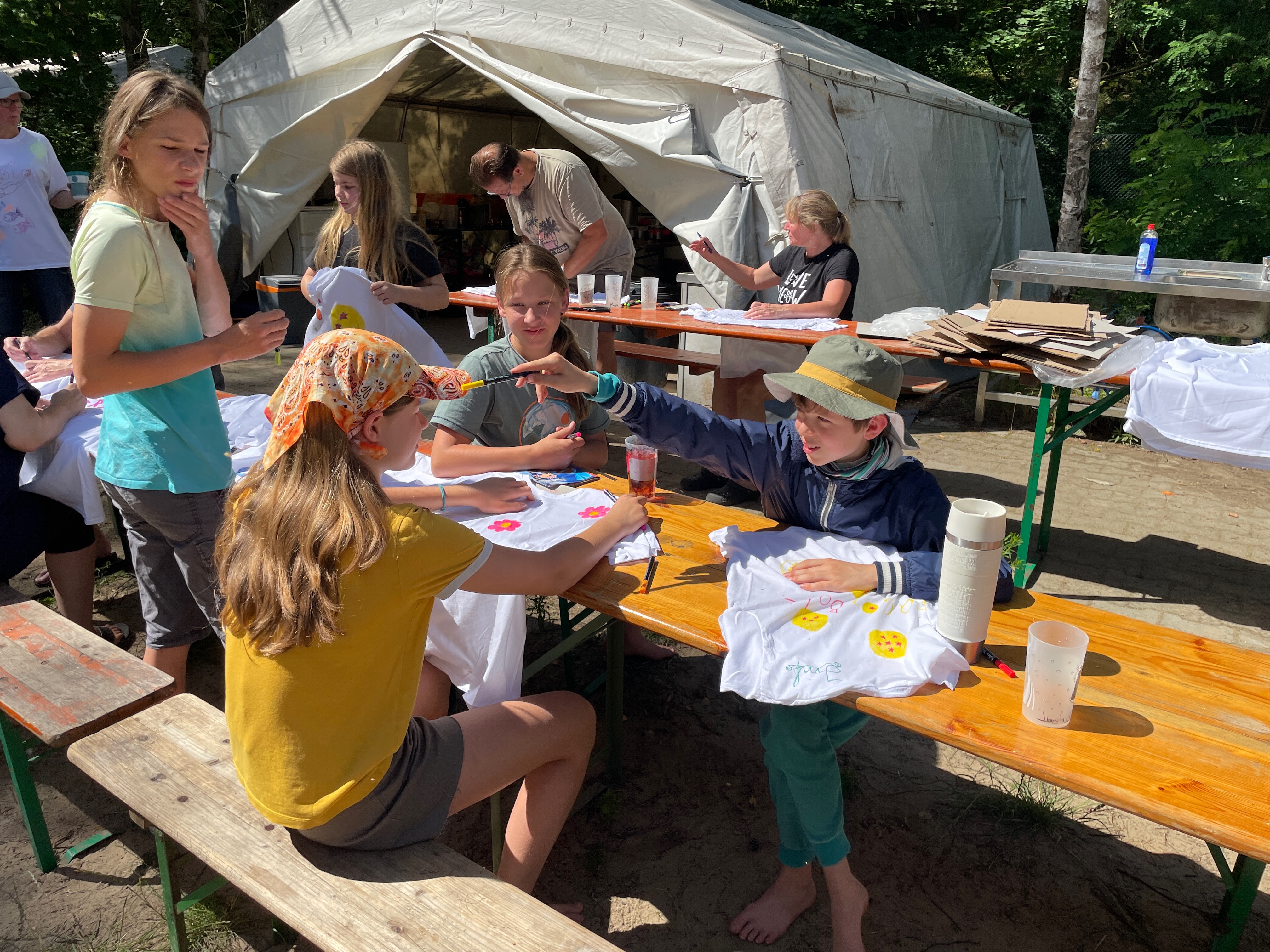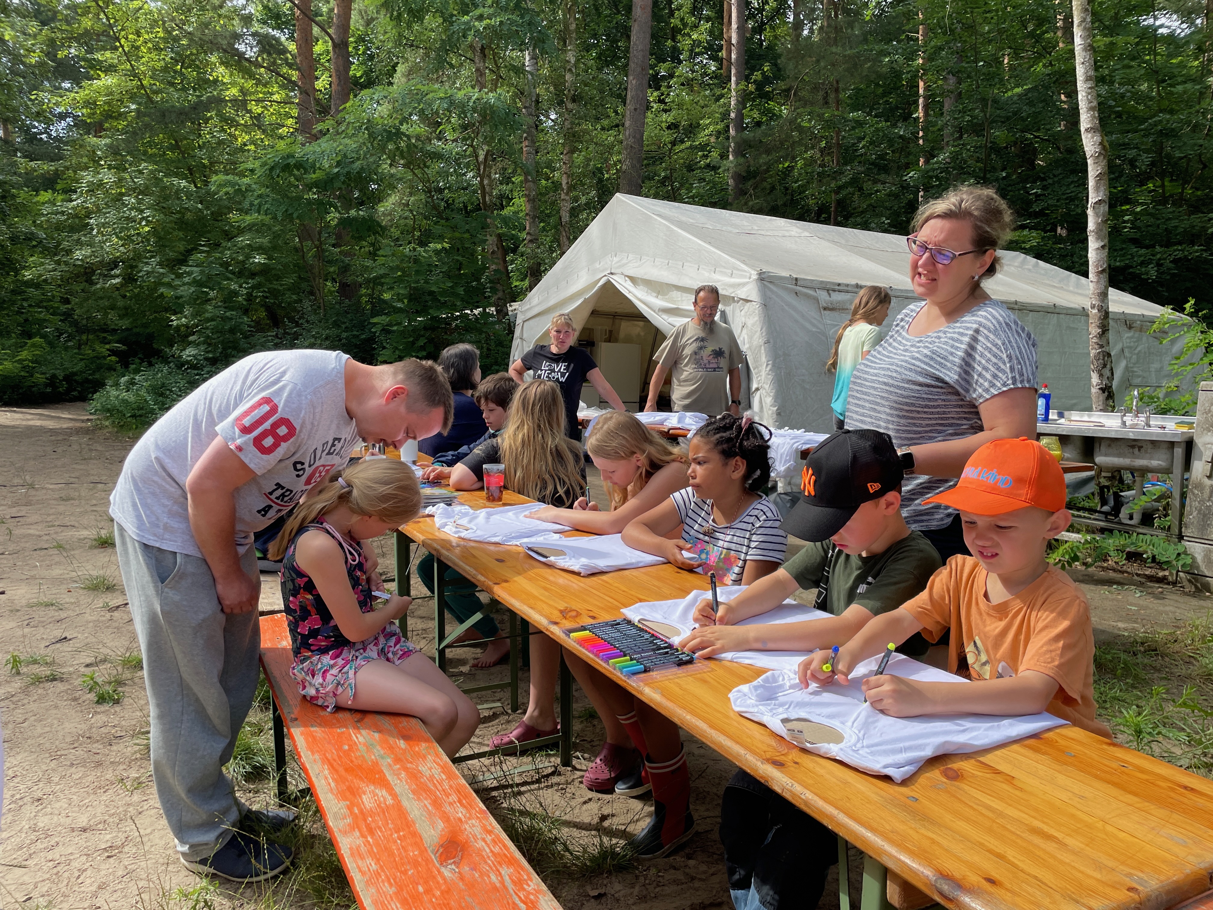 Nach einer ruhigen und erholsamen Nacht in den Zelten, gab es erst einmal ein stärkendes Frühstück. Ein großes Dankeschön geht hier an Sabine für den Brötchenservice. Am Samsatag Vormittag durfften dan alle Kinder und Betreuer ihrer Kreativität freien Lauf lassen. Es gab für jeden ein weißes T-Shirt und die passenden Stifte um dieses zu gestalten. So konnte jeder später eine schöne Erinnerung an dieses Wochenende mit nach Hause nehmen. Zum Mittag gab es später die von den Kindern geliebten Nudeln und Bolongnese bzw. Tomatensauce, die unsere Jugendwartinnen bereits zu Hause vorbereitet hatten. Nun gab es erst einmal eine kleine Mittagsruhe zur Verdauung, bevor es zum Baden and den Strand an der Havel ging. Unter der Aufsicht unserer Rettungsschwimmer konnten die Kinder hier im Wasser toben und am Strand ihre Burgen bauen. Den restlichen Nachmittag verbrachten die Kinder mit verschiedenen Spielen auf dem Zeltplatz. Am Abend wurde gemeinsam gegrillt und auch einige der Eltern schauten zu diesem Anlass bei uns vorbei. Großes Interesse gab es auch an den Spielen der Fußball-EM, die auf einen Fernseher vor dem Wohnwagen eines Betreuers verfolgt wurden. Zum Ausklang des Abends gab es noch ein Lagerfeuer mit am Stock gegrillten Marshmallows.